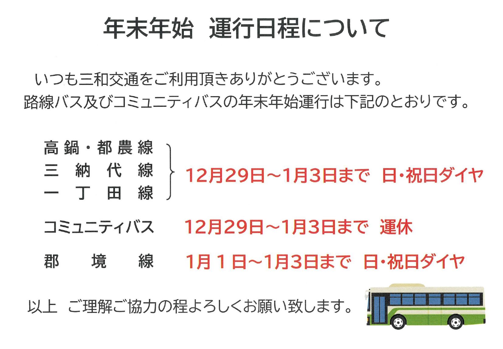 【路線バス・コミュニティバス】年末年始の運行日程について 2025/12/29 いつも三和交通をご利用いただきありがとうございます。 令和7年12月29日(月)~令和8年1月3日(土)の年末年始期間の運行ダイヤについて下記のとおりお知らせします。 通常ダイヤと異なるダイヤで運行しますので、ご利用の際は、お間違いのないようご注意ください。
